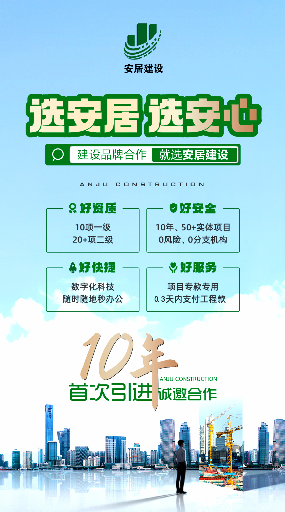 滔滔黃河哺育了中華民族拼搏向上的奮斗精神,巍巍太行造就了中原兒女的紅旗渠精神。百萬林州人下太行,鑄就了中國建筑之鄉響當當的耀眼品牌。河南安居建設有限公司從誕生起血液里就流淌著紅色基因,秉承“安得廣夏千萬間,大庇天下寒士俱歡顏”的擔當精神,用鋼筋混凝土筑起了高樓大廈,也用一流品質、家國情懷打造了安居建設的輝煌成績。公司成立于2012年,注冊資金12600萬元,公司成立至今,擁有建筑,市政施工總承包等十項一級資質;其他二級等資質共二十余項。公司秉承質量第一,服務為主,堅持垂直管理,從不設立分公司等分支機構。